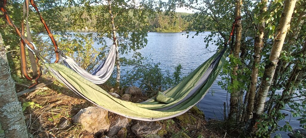 There are 2 hammocks down with the water.